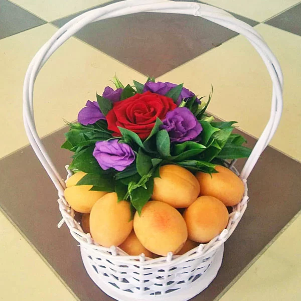 Стандартный: роза красная - 1 шт., эустома фиолетовая - 2 шт., рускус - 2 шт., оазис, корзина малая, абрикоса - 1,5 кг.